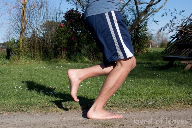 Now we’re getting into the nuts and bolts of barefoot running technique. If you’re just joining in, check out the info on keeping your head up and relaxing your shoulders & arms when running. It will make a world of difference in the enjoyability of your run! Moving down to your legs, this has to be one of the most important tips for barefoot running. It all has to do with getting rid of the nasty, jarring impact that happens every time you land on your heel with a straight, outstretched leg. You don’t feel the shock of the impact because you have so much padding in your running shoes, but it’s there, my friend. Believe you me. It’s there.